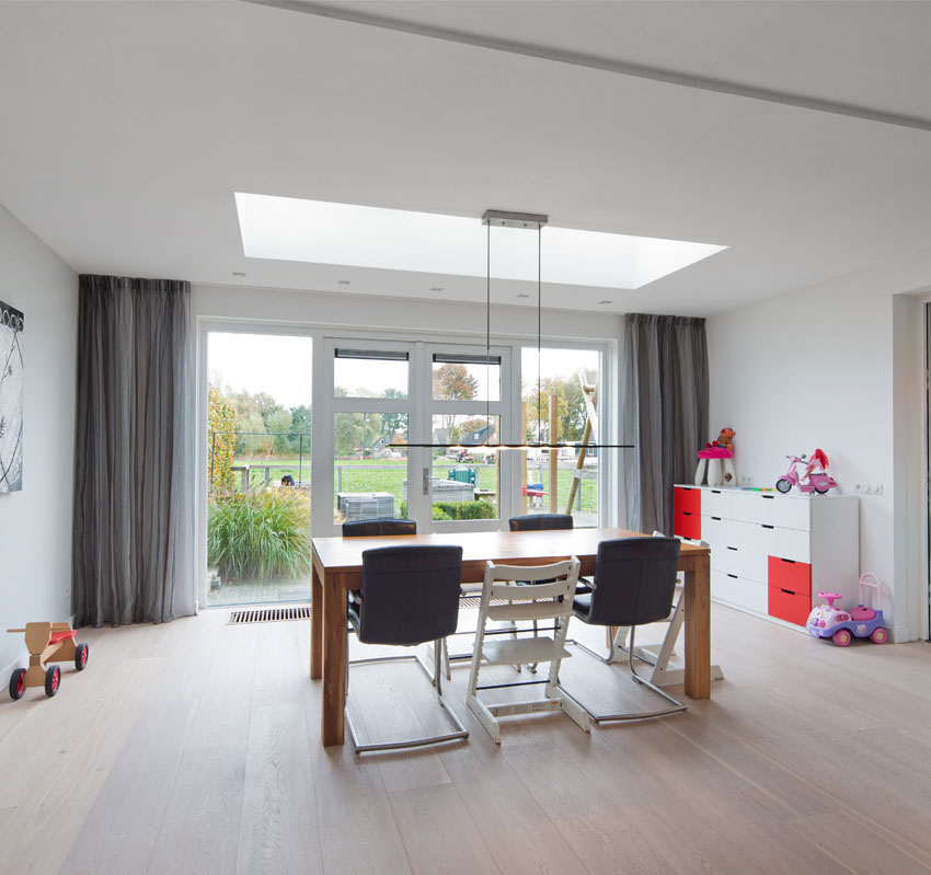 Door het uitvoeren van een uitbouw werd een fraaie ruime woonkeuken met veel lichtinval gerealiseerd.